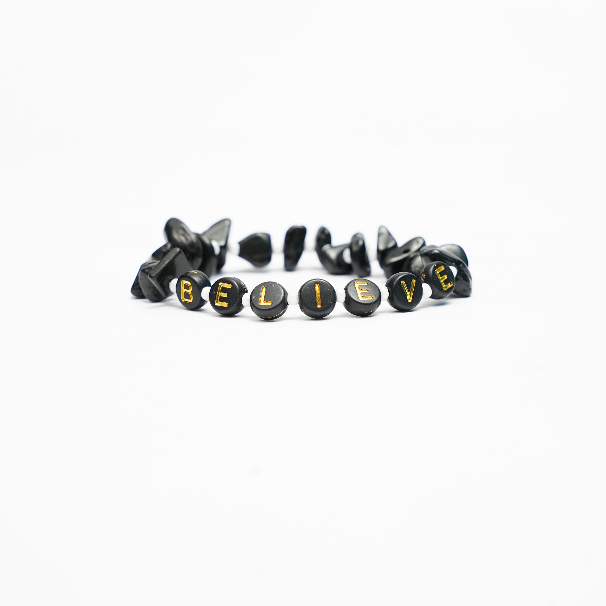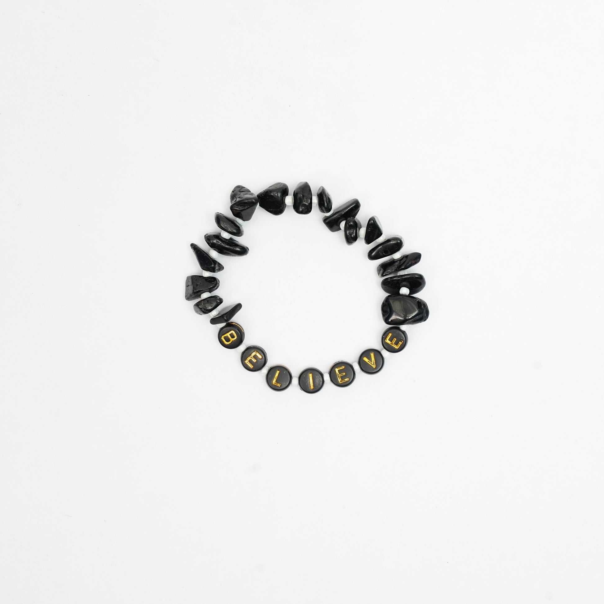 This powerful bracelet features raw black tourmaline chips (5–8mm) paired with letter beads spelling "Believe"—a daily reminder to trust yourself and stay grounded through life’s challenges. Black tourmaline is a protective stone, known for absorbing negative energy and promoting inner strength. Combined with the motivational message, this piece is more than just jewelry—it's a symbol of resilience and faith.