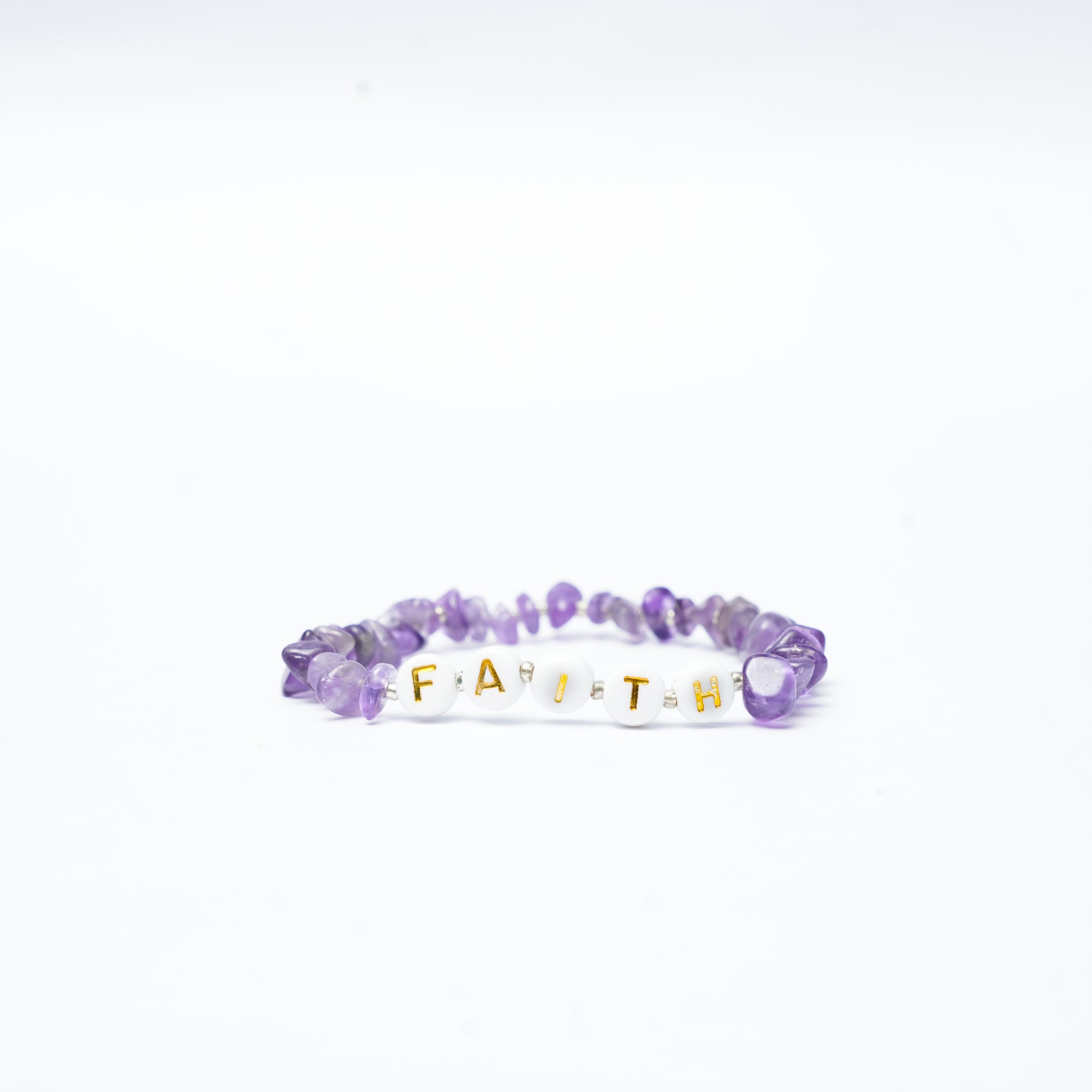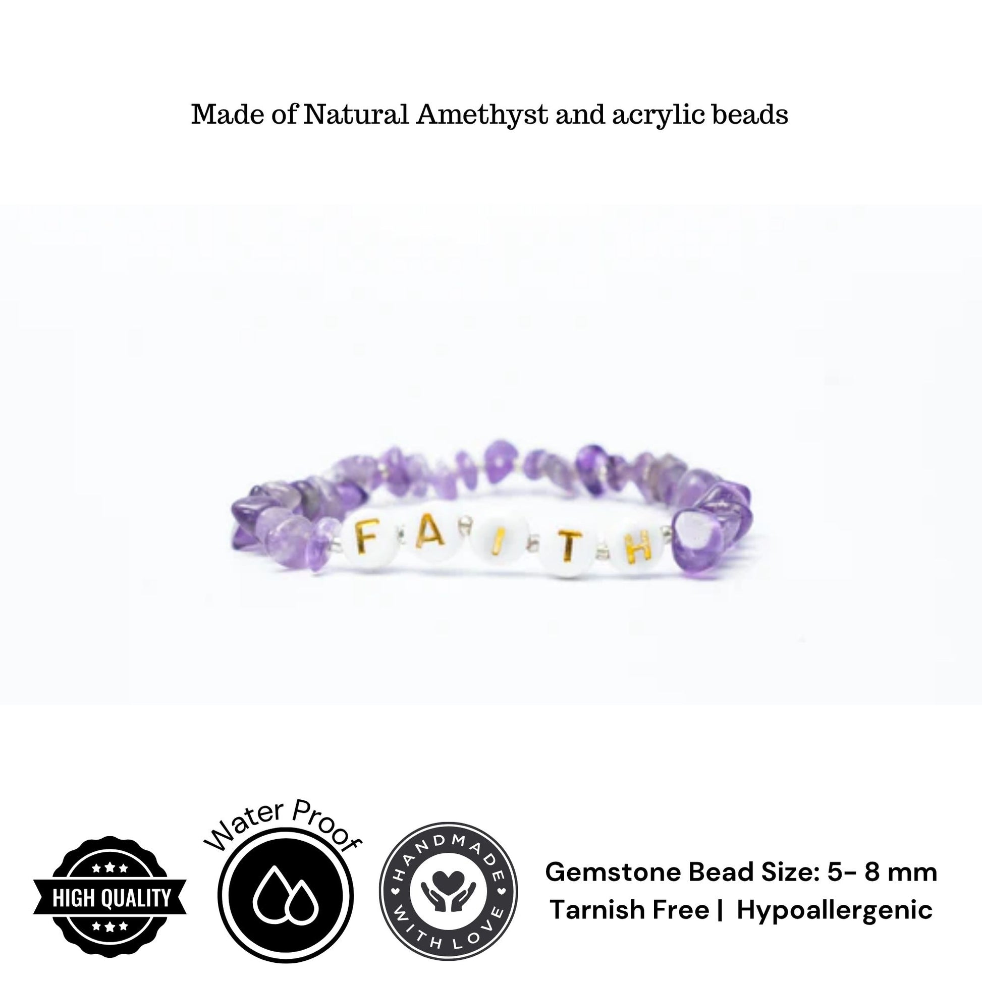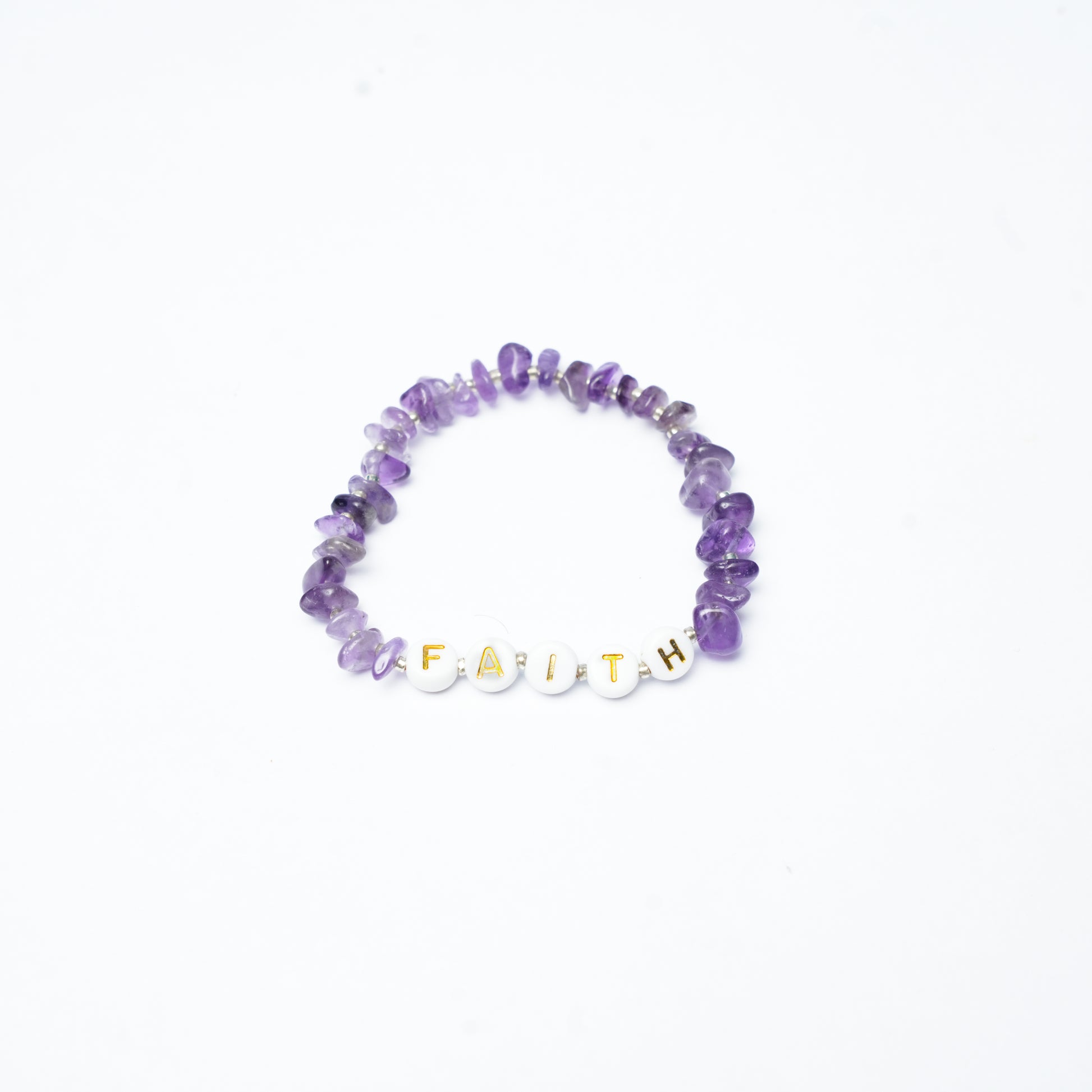 Find peace and trust in your journey with this inspirational stretch bracelet, handcrafted from natural Amethyst chip beads. Revered as a stone of calm, clarity, and spiritual connection, Amethyst supports intuition and inner peace. Accented with letter beads spelling FAITH, this bracelet serves as a gentle reminder to believe in yourself and the path ahead. Comfortable and easy to wear, it makes a thoughtful gift or a meaningful piece for your own collection.
