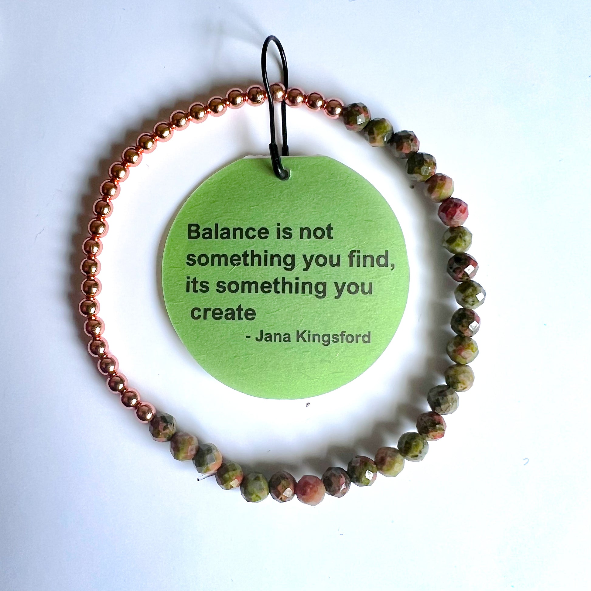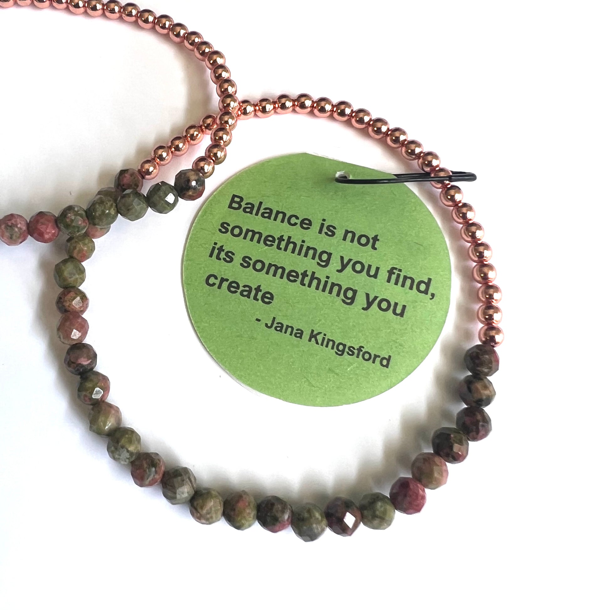 Dainty and Minimal Stretchy bracelets with multi-faceted 4mm Unakite + 3mm Solid copper beads Every bracelet comes with a tag that lists the properties of the gemstones and copper and is packed in a cotton pouch.
