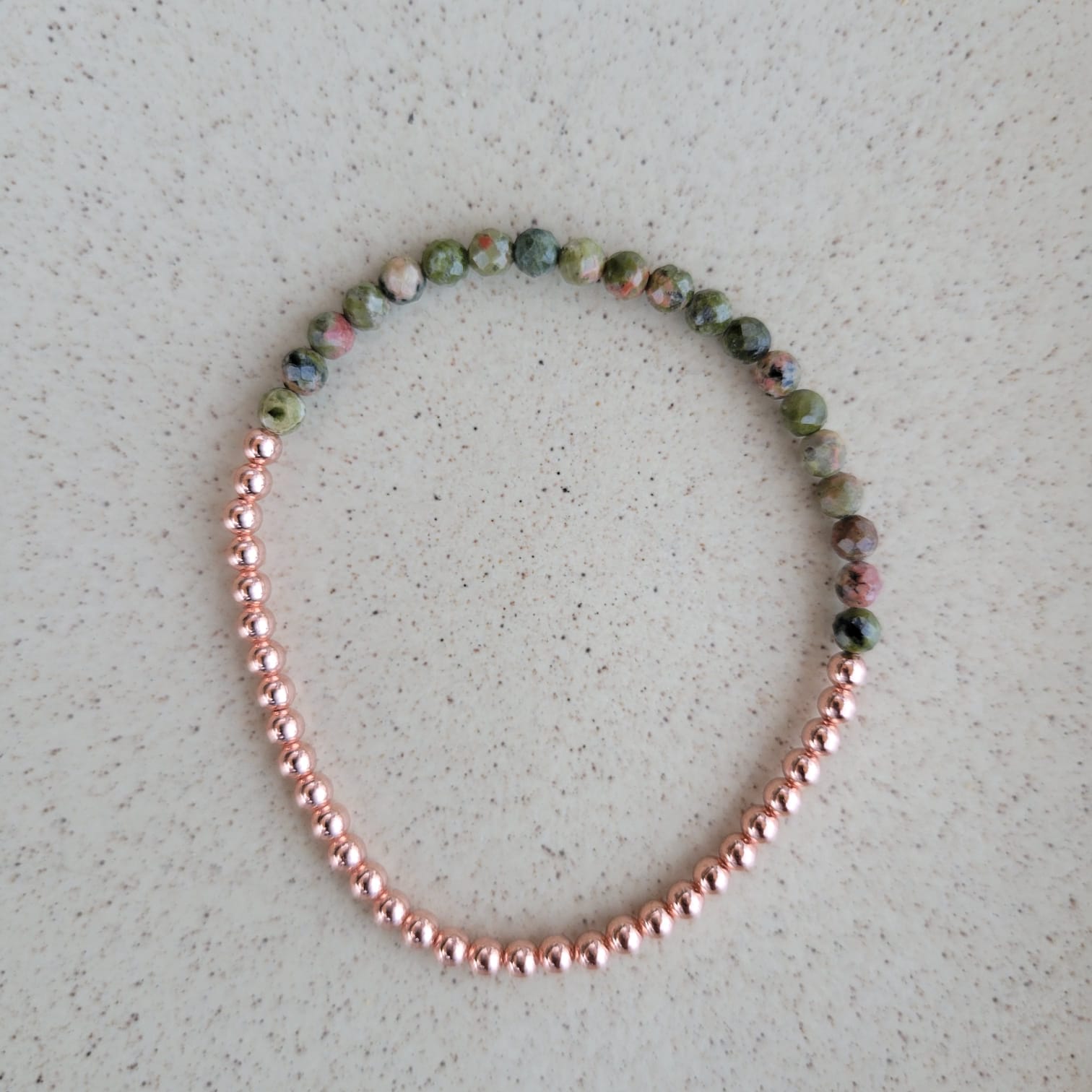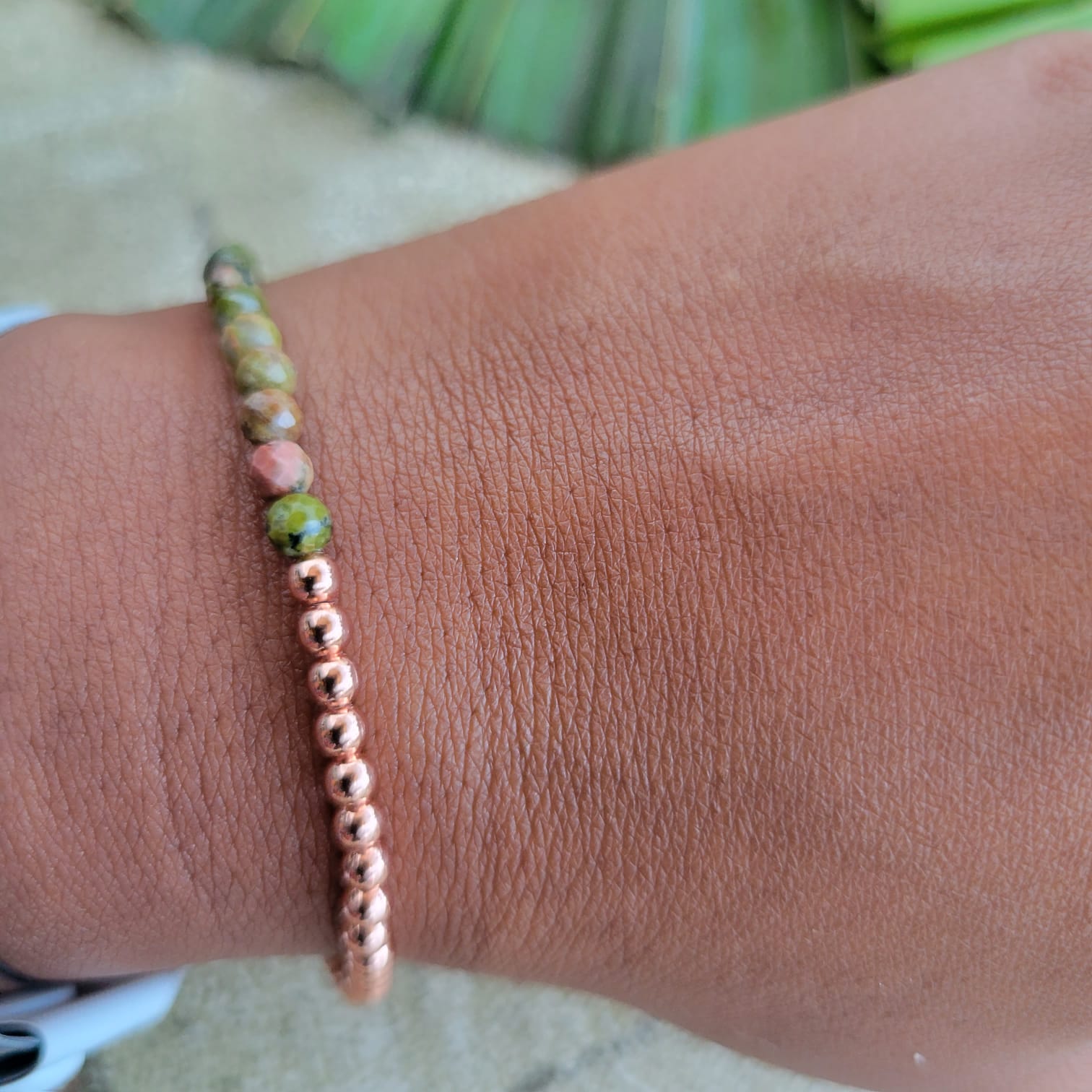 Dainty and Elegant Multi-Faceted Unakite beads + Genuine and solid 3mm Copper Bead Bracelet - Stretchy and Stackable