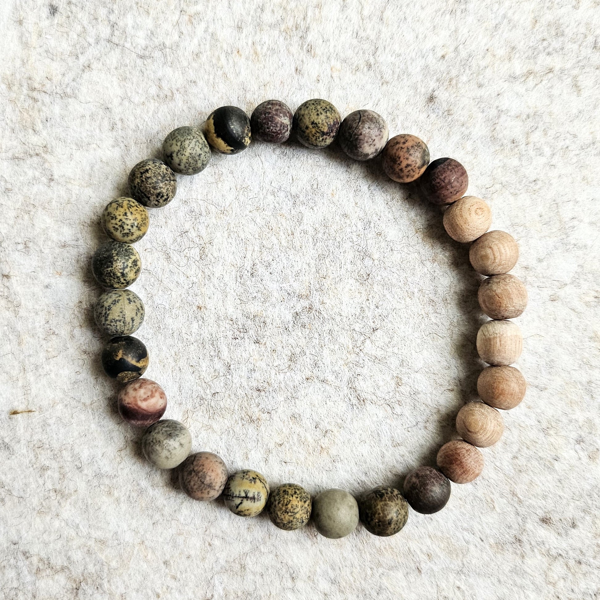 This Stretchy diffuser bracelet is made of 6mm Matte Natural Picture Jasper with unpolished rosewood beads. Turn this into an aromatherapy bracelet by adding a few drops of your favorite essential oils to the unpolished rosewood beads.