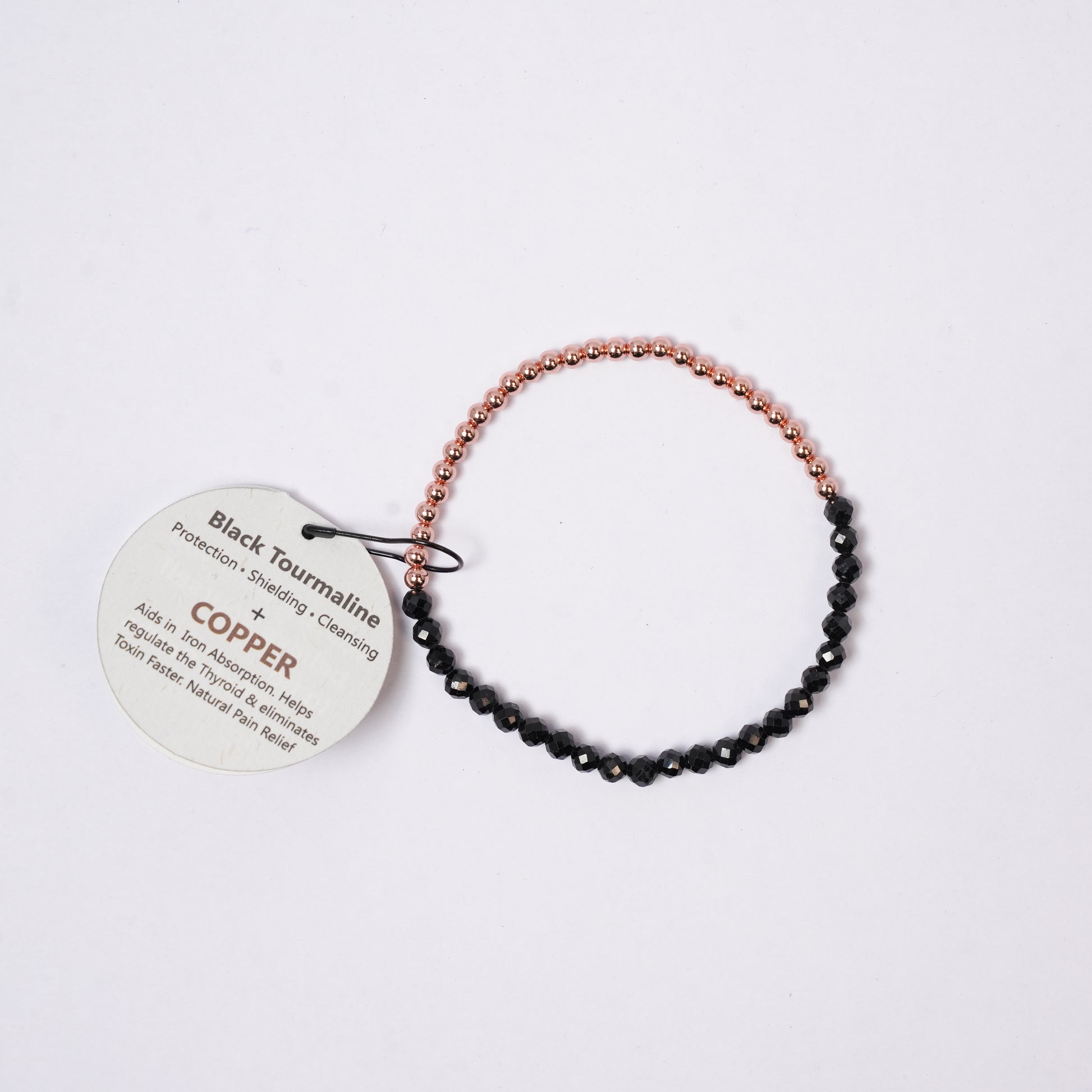 Dainty and Minimal Stretchy bracelets with 4mm Faceted Black Tourmaline beads + 3mm Solid copper beads.