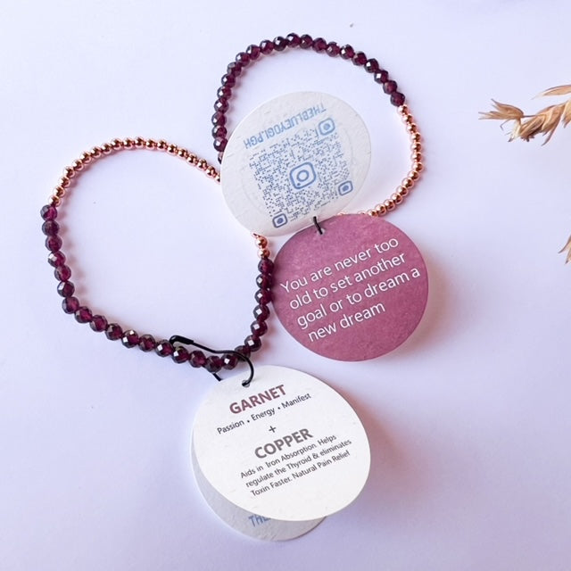 Dainty and Minimal Stretchy bracelets with multi-faceted 4mm Garnet + 3mm Solid copper beads Every bracelet comes with a tag that lists the properties of the gemstones and copper and is packed in a cotton pouch.