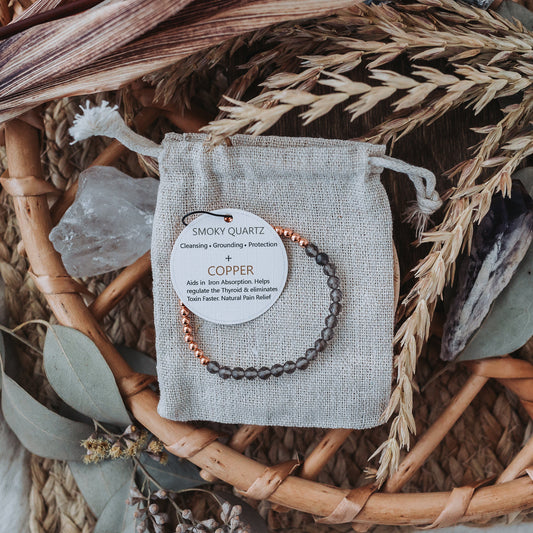 Dainty and Elegant Multi-Faceted Smoky Quartz beads + Genuine and solid 3mm Copper Bead Bracelet - Stretchy and Stackable